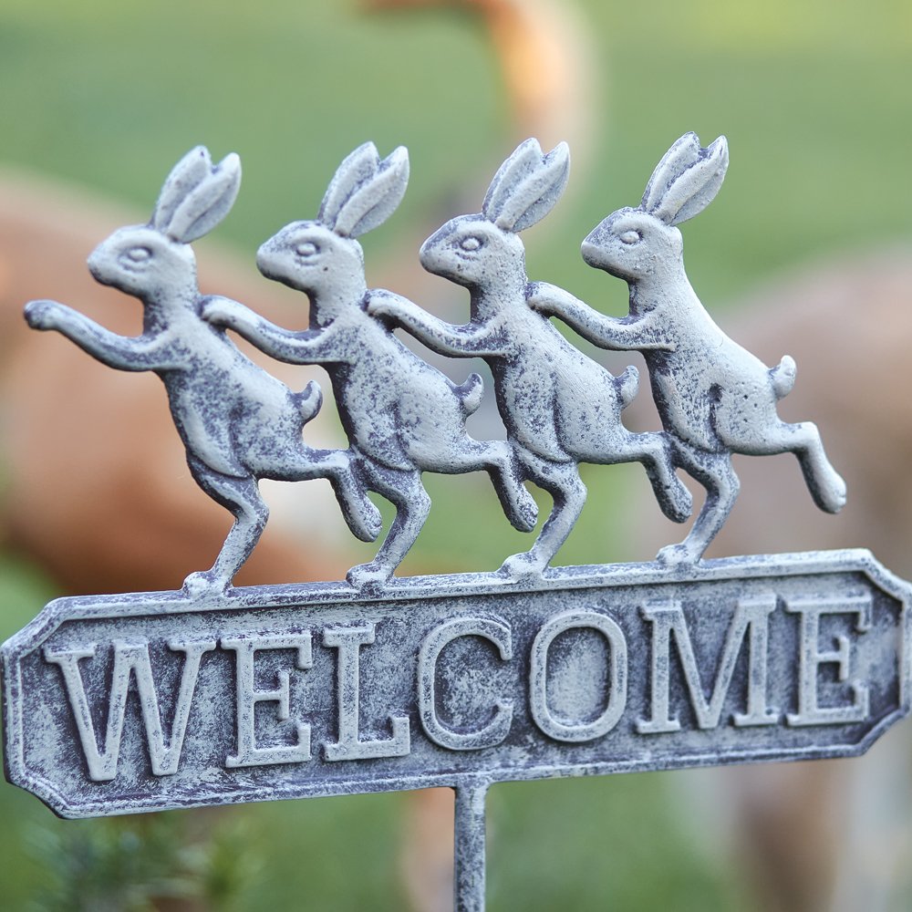 Our dancing bunnies are the most endearing welcome. Place this cast iron garden stake along a walkway or at an entrance of a garden.