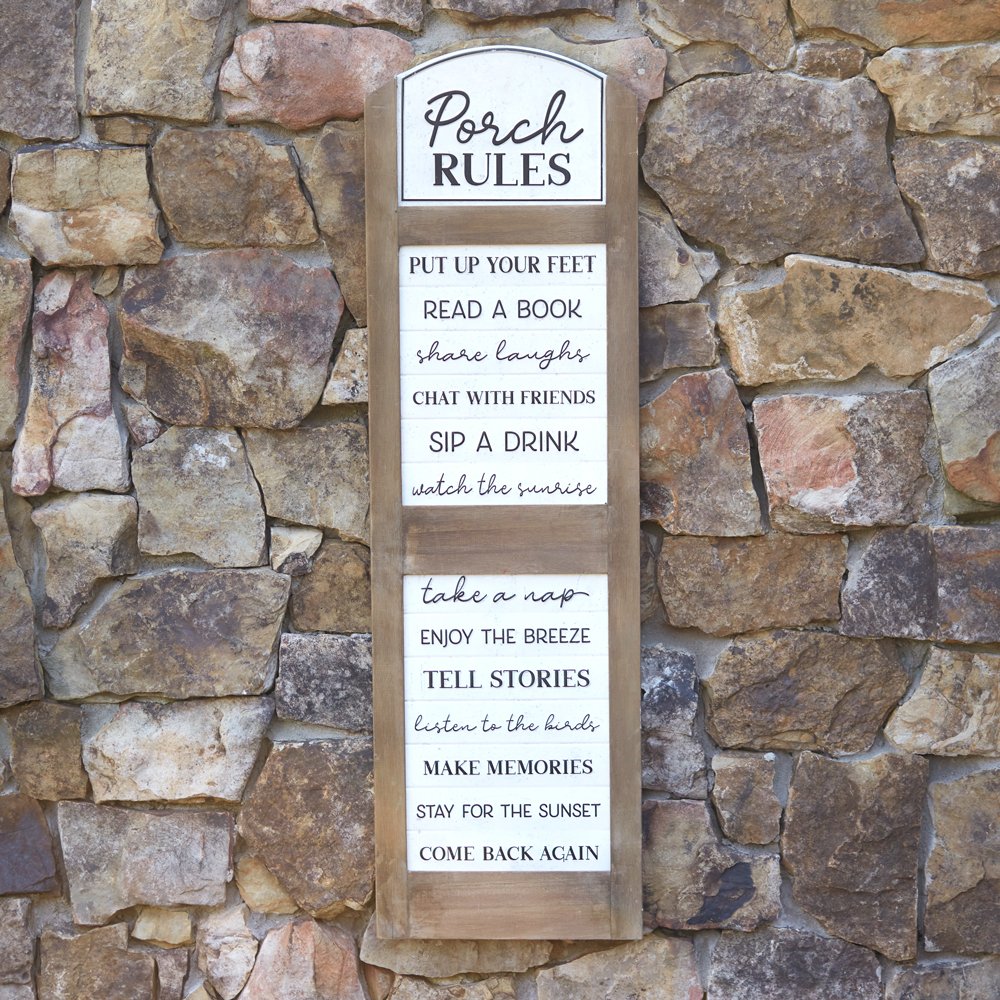 Add a touch of charm to your outdoor space with this Porch Rules Hanging Sign. This rustic sign features a list of porch rules such as "Relax, Sip, Chat, Enjoy" and is perfect for adding a welcoming touch to your front porch or patio. Made of durable wood and featuring a weather-resistant finish, this sign is ideal for outdoor use. Hang it on your porch railing or front door to greet guests with a warm message. This Porch Rules Hanging Sign is a great addition to your outdoor decor and makes a wonderful gift for friends and family. Perfect for farmhouse, rustic, or country-style homes. Shop now and elevate your porch decor!