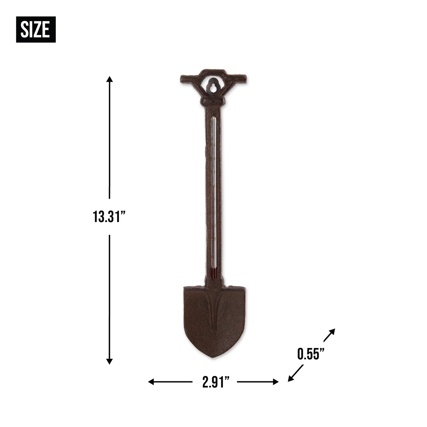 • This shovel shaped thermometer is made from durable cast iron and perfect for decorating your garden or yard space. Easy to hang and suitable for both indoor and outdoor use.